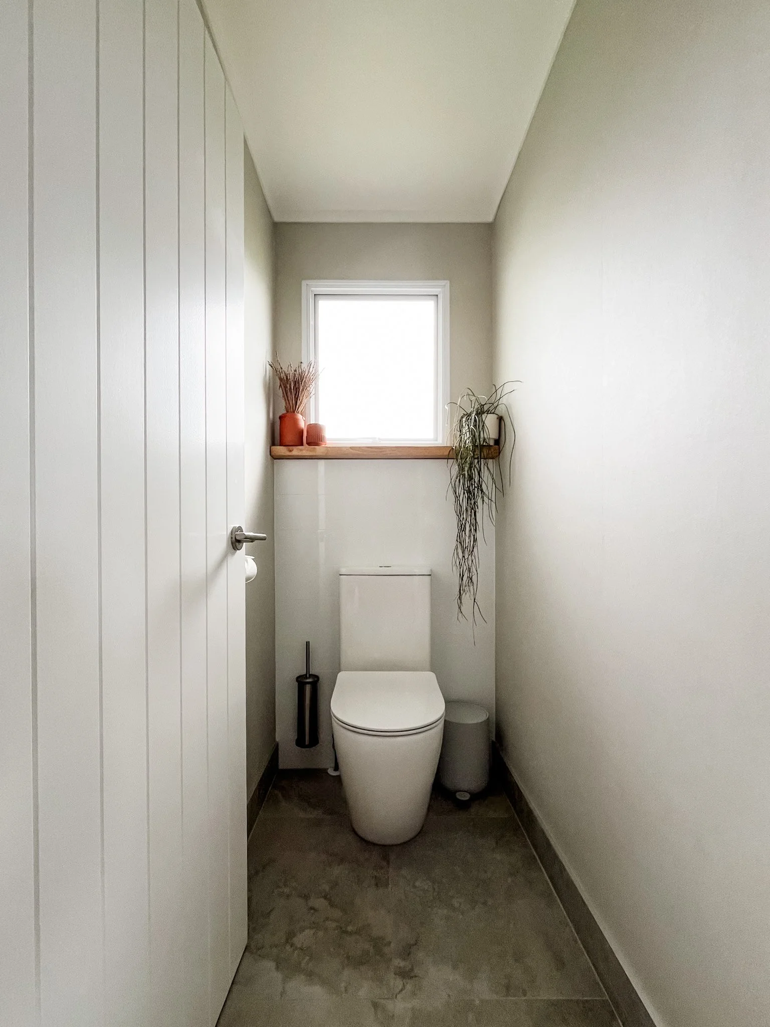 Custom-made wall shelf above toilet tiles made from Kaboodle 36mm Square Edge Hevea Timber Benchtop